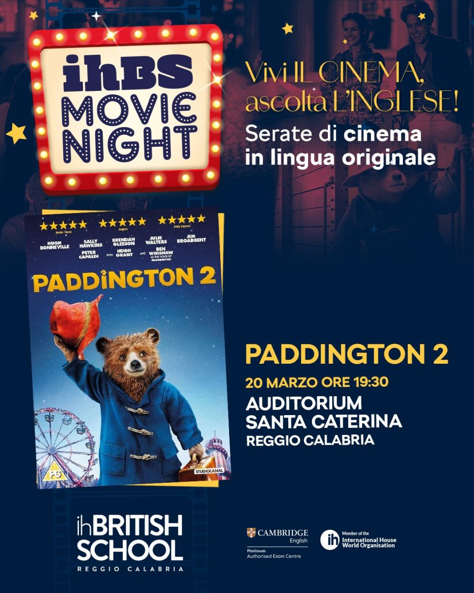 Il prossimo film in programma è Paddington 2: una splendida avventura ambientata a Londra, dove il nostro orso preferito si ritrova coinvolto in un mistero esilarante e commovente. Tra marmellata, umorismo tipicamente britannico e scene spettacolari, è il film perfetto per lasciarsi conquistare dalla gentilezza e migliorare l'inglese.